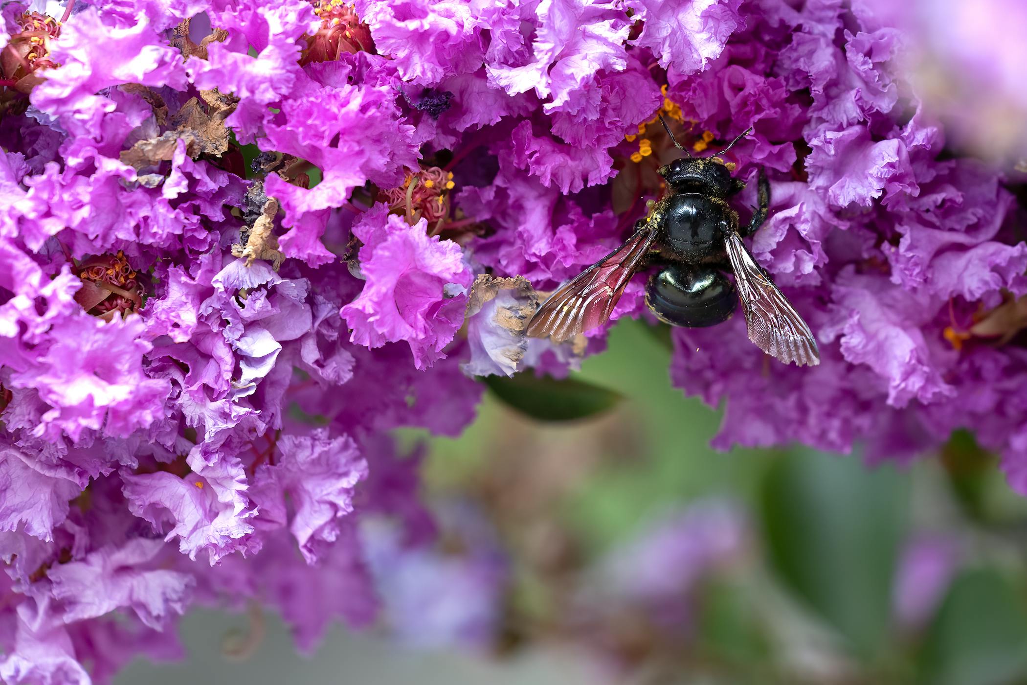 Female carpenter bees can sting but rarely do unless they’re handled or severely threatened